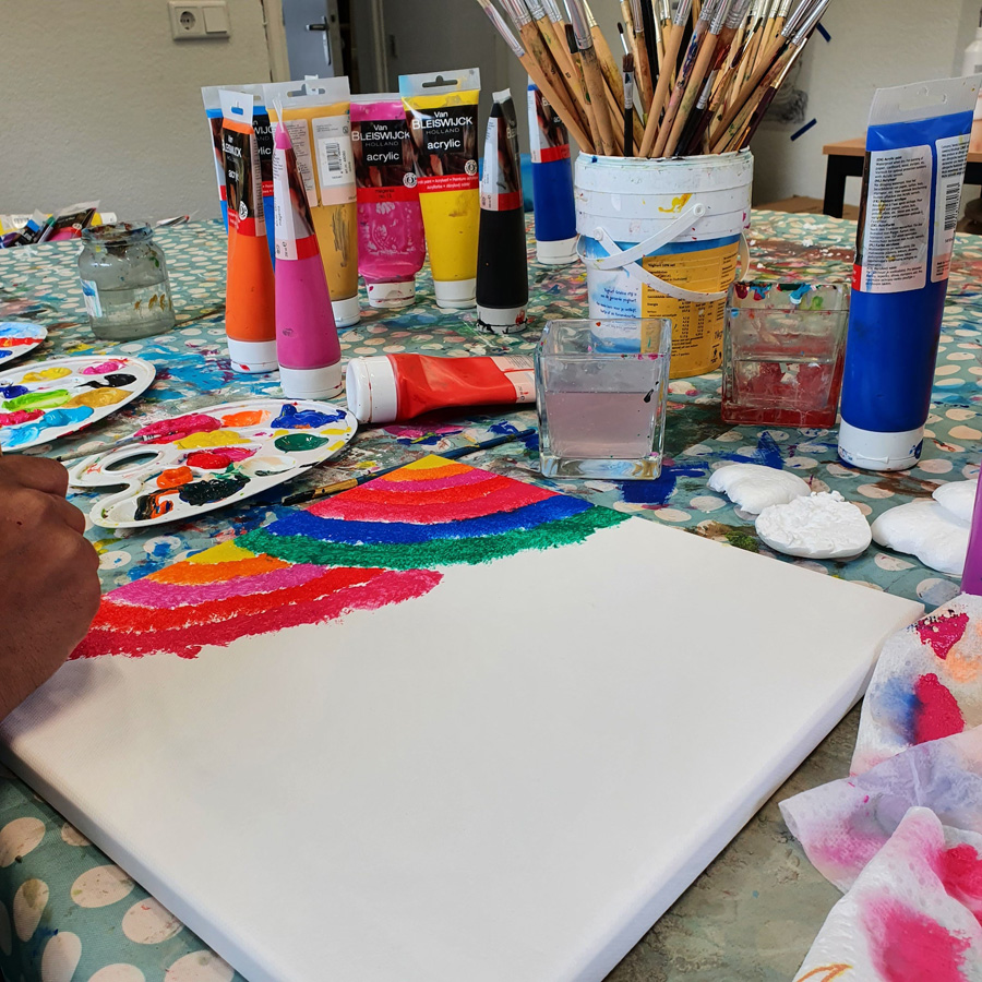 geschilderd met kinderen die woonachtig zijn op het AZC Middelburg. De kinderen hebben prachtige kleurrijke schilderijen